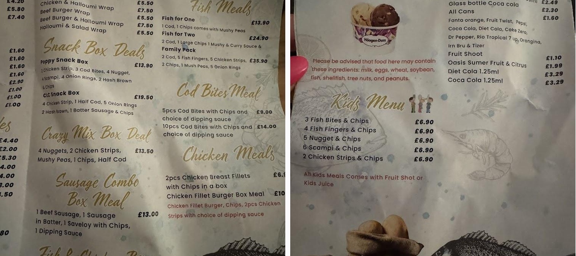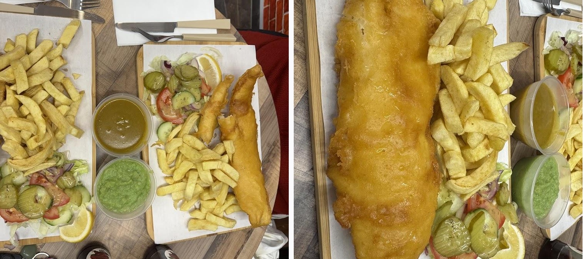 Me and my boyfriend had half a cod and chips from here and it was lovely. The fish is so fresh and the batter is so crunchy. The chips are fluffy inside. Staff are very welcoming. The portion size is just right aswell. Will definitely be going back again 👍🏻