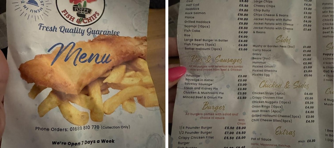 We had superb meal in Poppies fish and chip shop tonight. Cod for 2 deal with chips, side salad, mushy peas and a pot of curry sauce for £24.90. Batter was thin and very crispy, fish tasty and moist, we ate in shop and it looked very appetising. We will certainly be returning, it’s well worth the trip to Green Street Green.